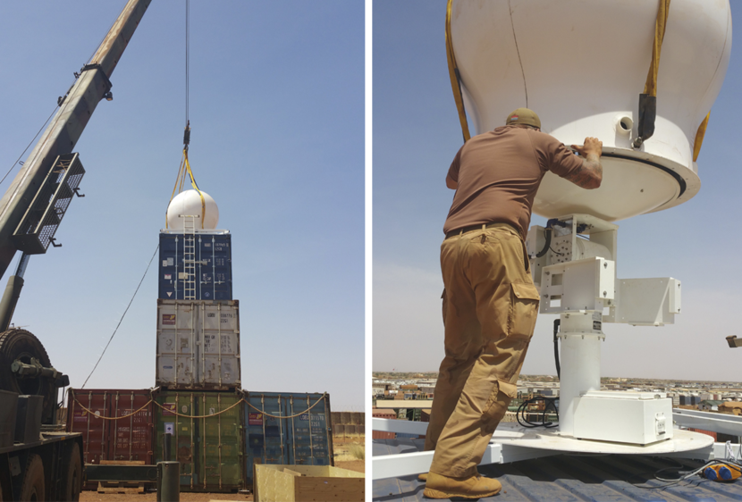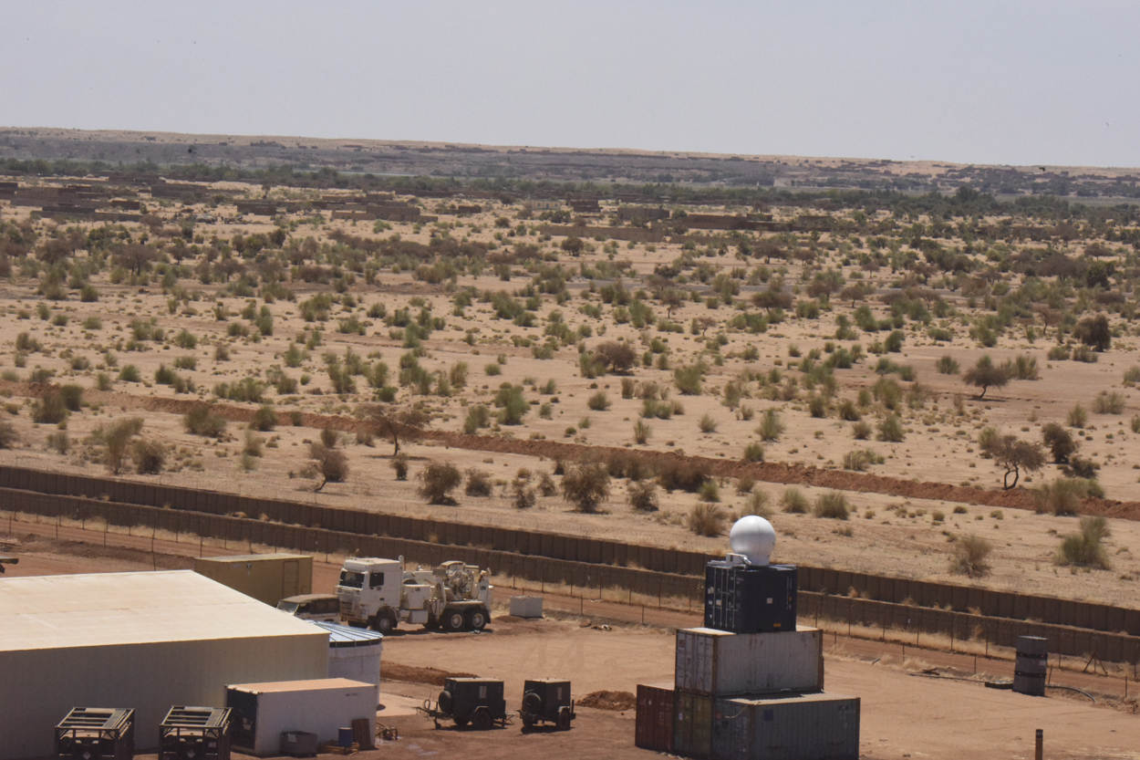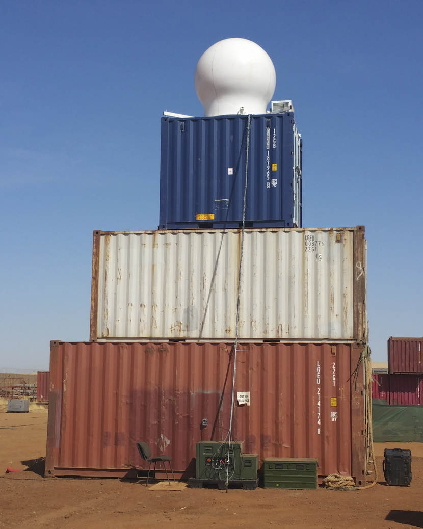 Vanwege de omheining en de hoge gebouwen op Kamp Castor in het Malinese Gao staat de radar op een flinke hoogte. Zeven meter boven de grond heeft het apparaat vrij zicht. Foto: archief JMG.