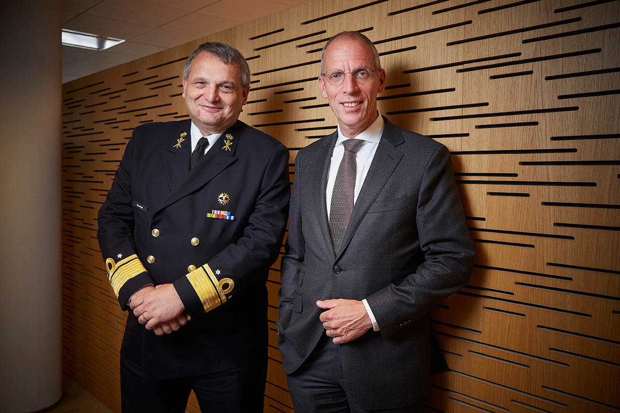 Schout-bij-nacht Maarten Tossings (links) is als Chief Information Officer verantwoordelijk voor de beleidsvisie op IT. Directeur JIVC Ron Kolkman: “Wij bij het JIVC en OPS zijn elke dag bezig met het onderhouden en verbeteren van de systemen.”