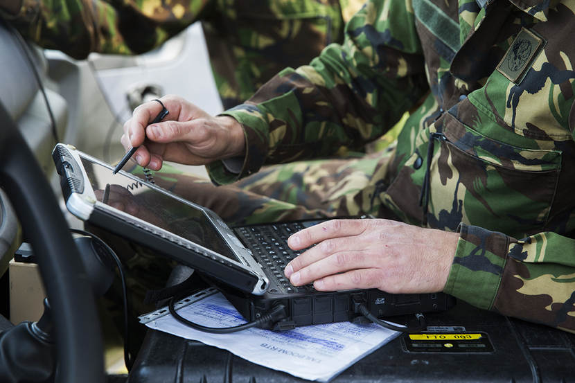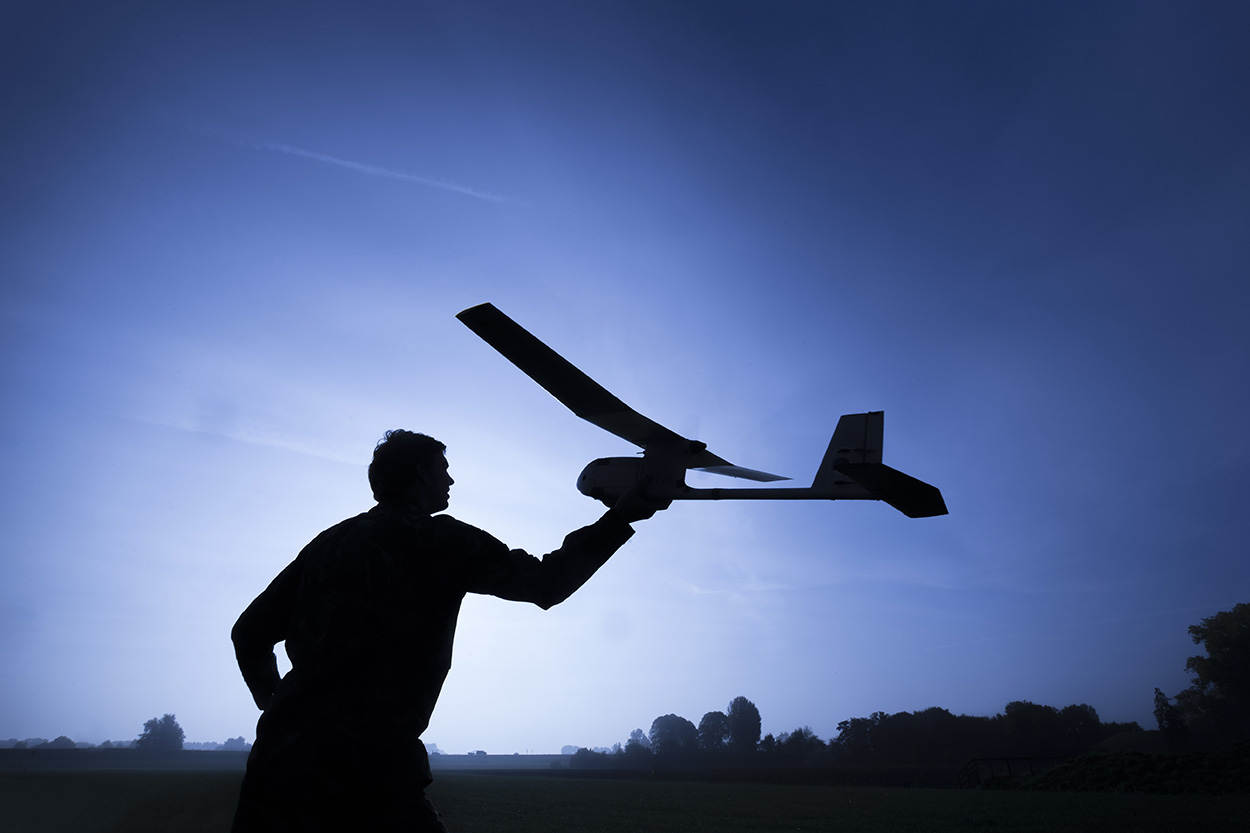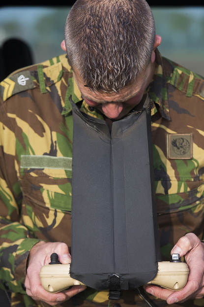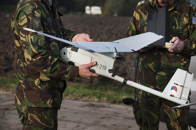 Als een ogenschijnlijk volleerd speerwerper gooit een militair van 107 Aerial Systems Battery een drone van het type Raven de lucht in. Vanuit een rijdend busje volgen vertegenwoordigers van de Defensie Pijpleiding Organisatie (DPO) de testvlucht live op een laptop. Hamvraag: is het efficiënt om ons tracé in de toekomst met een Raven te inspecteren? De helikoptervluchten waarmee dat nu gebeurt kosten veel geld.