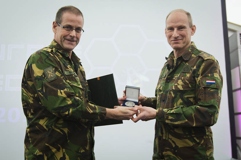 Mister Purple Nectar luitenant-kolonel Duco Brongers (KIXS) krijgt uit handen van Commandant Landstrijdkrachten luitenant-generaal Leo Beulen de legpenning in zilver.