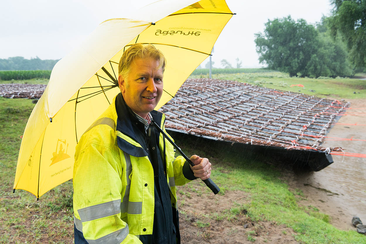 Een zware stalen balk zorgt ervoor dat de zinkmat naar de rivierbodem zakt. Daarna begint het lossen van het basalt. Met een mooie ‘zwiep’ weet de kraanmachinist iedere lading over een deel van de mat te verspreiden. Niewenhuis en De Bresser kijken toe. Ze hebben er vertrouwen in. “Die mannen doen dit niet voor het eerst”, weet Niewenhuis. Morgen krijgt het deel aan de zuidkant dezelfde afwerking en zit het karwei er op. Eind goed, al goed.