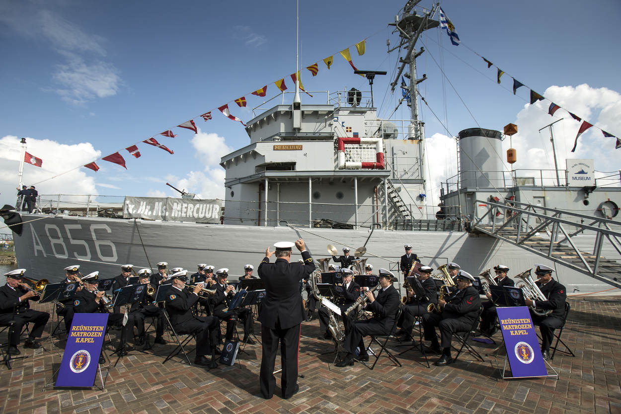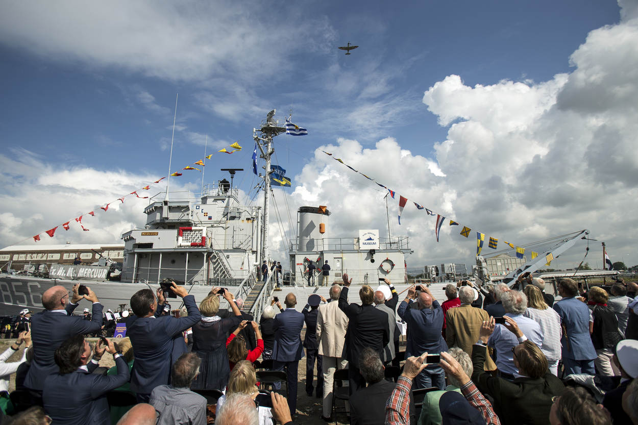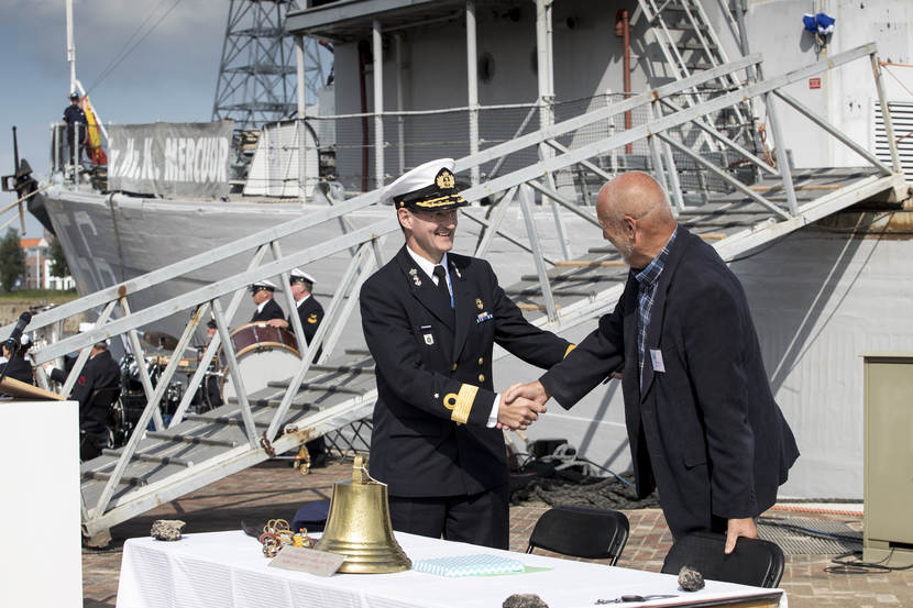 Hoewel commandeur Brummelaar de overdracht aan voorzitter en ‘korporaal 1 buiten dienst’ Niek Peters mocht doen, zwaaide iedereen vooral Beijert lof toe voor zijn inspanningen. “Er zijn, ik heb ze nageteld, 925 e-mails en talloze telefoontjes voor nodig geweest om de ex-Hr.Ms. Mercuur hier aan de kade te krijgen”, zei Peters. “Het klinkt gek uit de mond van een marineman, maar voor het eerst ben ik blij dat we een schip mogen afstoten”, zei Brummelaar. “In 1990 was de Mercuur voorbestemd om te eindigen als een parketvloer, 2 jaar geleden leek weer het einde te komen. En kijk nu eens!”