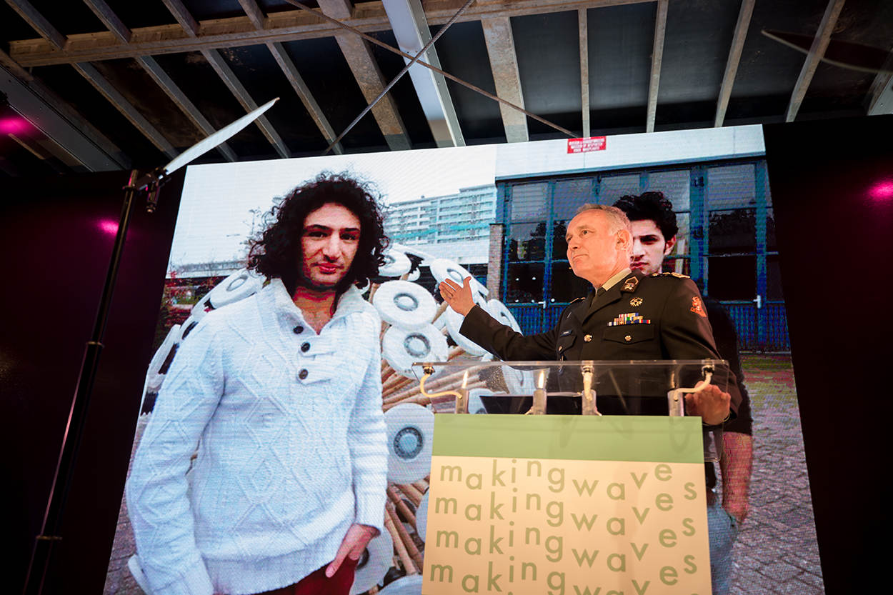 Een drone die mijnen opzoekt en vernietigt. Een waterval in de woestijn door vocht uit de lucht te halen. En jassen, wegverhardingsplaten, stoelen, tafels en bouwpalen die grotendeels uit versleten gevechtskleding worden gemaakt. Het waren 3 van de 17 toepassingen die werden gepresenteerd tijdens de manifestatie Making Waves, midden op de Afsluitdijk. “Een inspirerend evenement”, oordeelde DMO’s Mireille Hendriks-De Jonge, contractmanager bedrijfskleding Rijk.