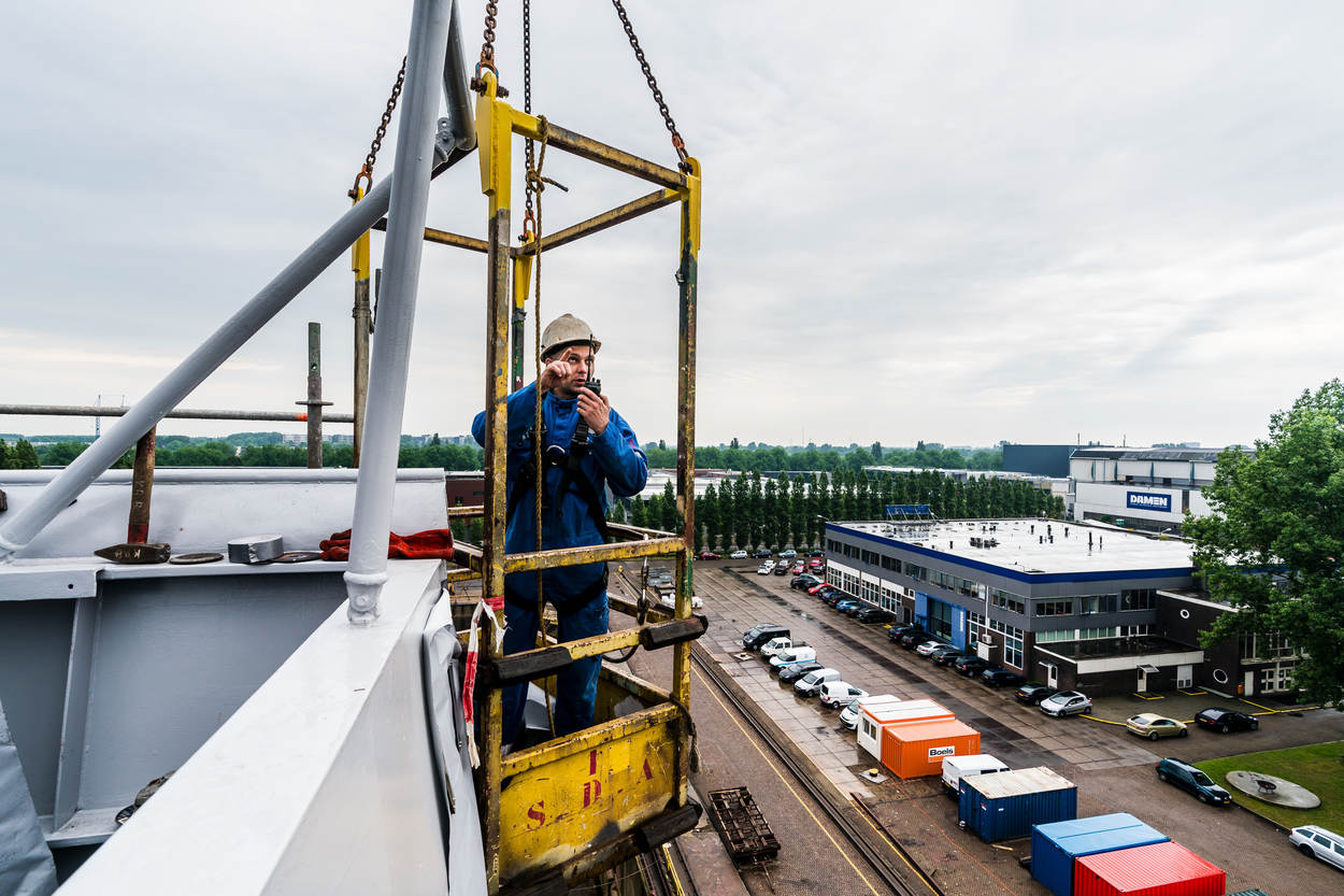 ‘Very big job’ grijnst een werknemer die laswerk aan de buitenkant van het schip verzorgd.