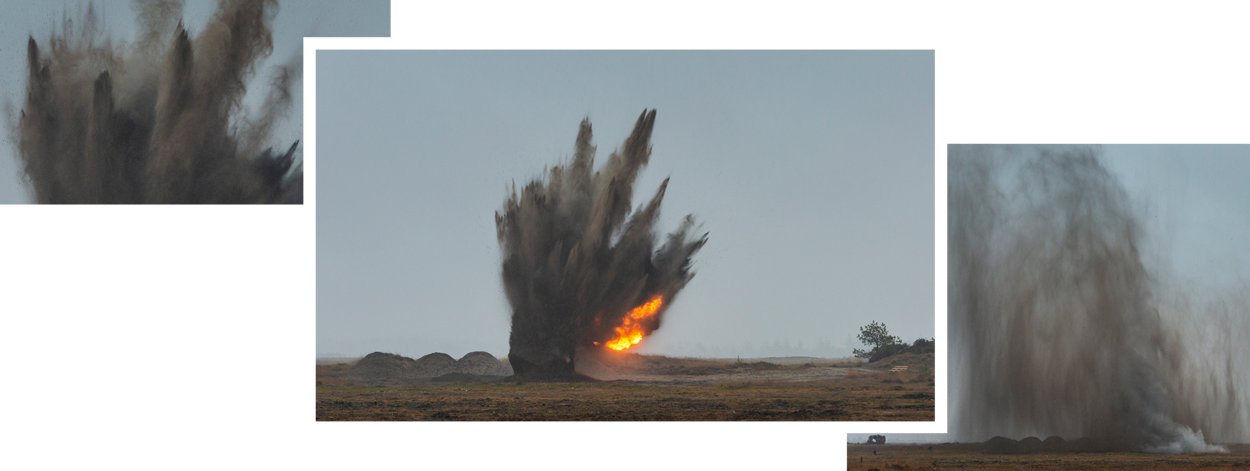 En dan is kapitein Luijters onverbiddelijk: iedereen de bunker in of op grote afstand. De beeldmakers ter plekke willen natuurlijk een mooie opname maken van de ‘grote boem’, het slotstuk van de operatie. “In alles dat we doen, staat veiligheid op 1, 2 en 3”, herhaalt majoor Klaver nog maar eens. “Dat geldt ook voor de tests die we uitvoeren. Je wilt immers dat onze militairen als het erop aankomt, kunnen vertrouwen op onze wapens en munitie.”