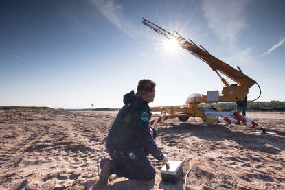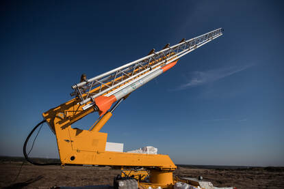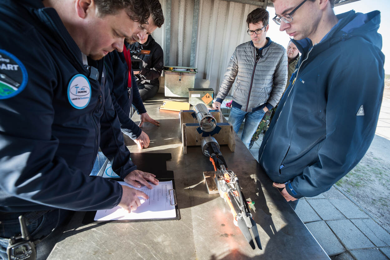 Het Artillerieschietkamp is voor even een soort mini Cape Canaveral. Technici van Delft Dynamics en T-Minus Engineering ‘verpakken’ een drone in de kop van een oranje-zilveren raket. Sissend in een wolk van witte rook verlaat het projectiel het lanceerplatform en verdwijnt uit zicht. Meetapparatuur, laptops, camera’s en antennes verzamelen vluchtdata. Lukt het om een drone voor het eerst zó te transporteren? Ja en nee. Defensie kijkt geïnteresseerd mee.