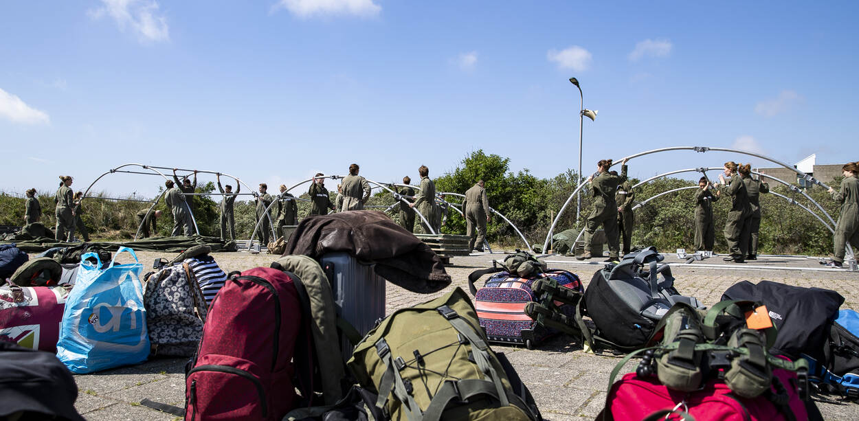 Werk aan de winkel! De Jong DMO’ers moeten samenwerken om de boogtenten goed en snel op te zetten.