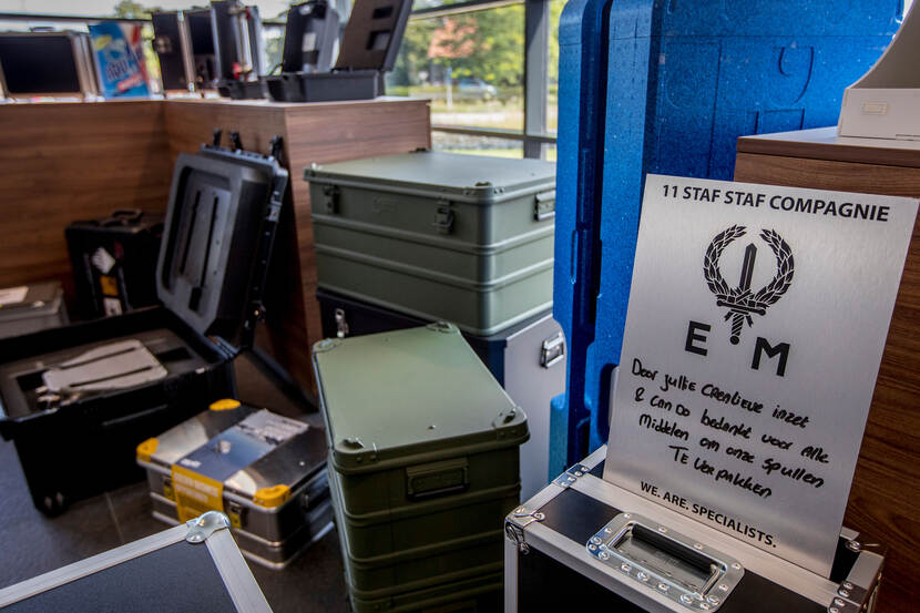 Bij het betreden van de markante thuisbasis van Faes Cases aan de Hamelendijk in Reusel wordt direct duidelijk dat men hier trots is op de samenwerking met Defensie. “Door jullie creatieve inzet en can do: bedankt voor alle middelen om onze spullen te verpakken. 11 Staf Staf Compagnie EM”, pronkt op een bordje naast de ingang. “Mooi hè”, zegt Faes Cases-medewerker èn kapitein buiten dienst Henk Hardeman wijzend naar de ingegraveerde plaquette. “Gekregen van onze landmachtcollega’s tijdens de oefening Red Griffin. Dit benadrukt wel onze goede band met Defensie.”