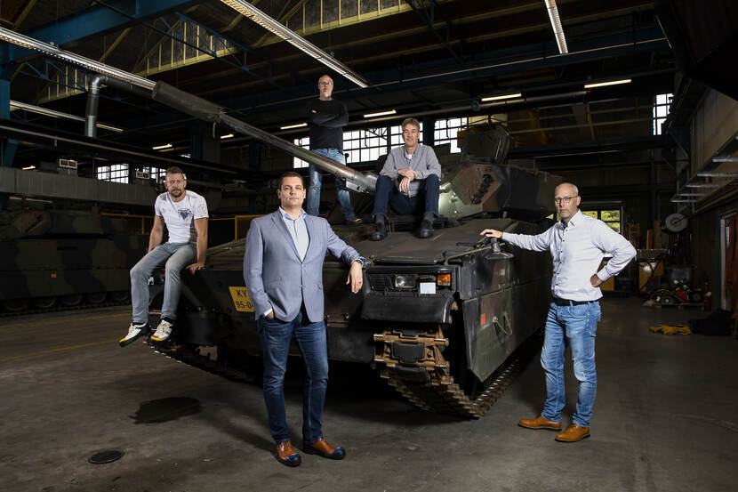 Het multidisciplinaire team dat werkte aan de virtualisatie van ELIAS op hun demo-CV90. Van links naar rechts William van de Velde, technisch specialist KIXS, projectmanager Harmen Mooibroek, software-ontwikkelaars van het JIVC Gerard Sillekens en Percy Pols en Jan Schaapherder, MatlogCo afdeling Techniek.