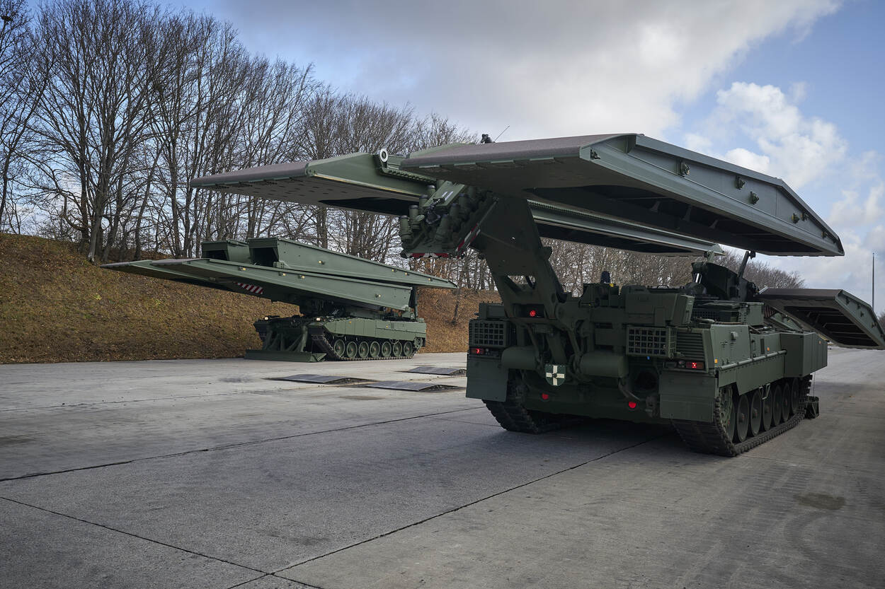 Het is nog wel even wachten tot de Defensie Materieel Organisatie ze kan afleveren bij de landmacht, maar de eerste 2 van de 8 Combat Support Bridge (CSB) Leguaan Leopards 2 zijn ‘binnen’. Plaatsvervangend directeur DMO generaal-majoor Ivo de Jong en projectleider Jacques Roosenboom namen vorige week de imposante voertuigen in ontvangst bij ‘bouwer’ Krauss-Maffei Wegmann in München.