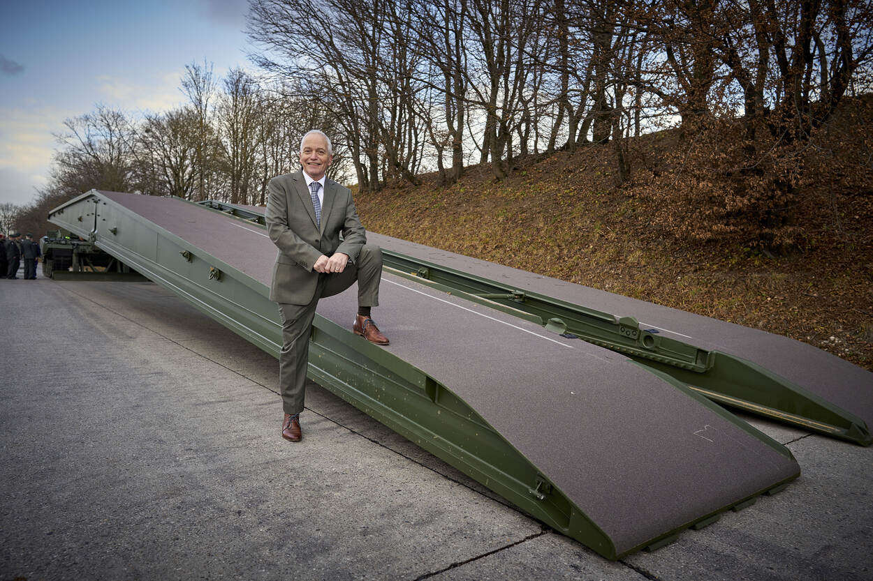 Maar nu staat en rijdt er dus wat. Vandaar dat Roosenboom zich na een imposante demonstratie de loftuitingen van een van de directeuren van KWM, Ralf Ketzel, liet welgevallen. Er is immers in 1 contract samen met de Duitse evenknie van DMO, het BAAINBw, opgetrokken om 15 van deze systemen te kopen. Onderhandelingen over Nederlandse wensen verliepen vrij soepel. “Toch waren er vlak voor de overdracht nog wat problemen weg te poetsen, maar dat maakt het werk juist leuk”, bekent hij. En het project is voor Roosenboom nog niet ten einde. Hij wil nog met KMW in de slag voor het leveren van aanhangwagens voor de extra brugdelen. “Maar dit is een mooi slot voor een project dat in feite in de jaren 90 al is begonnen.”