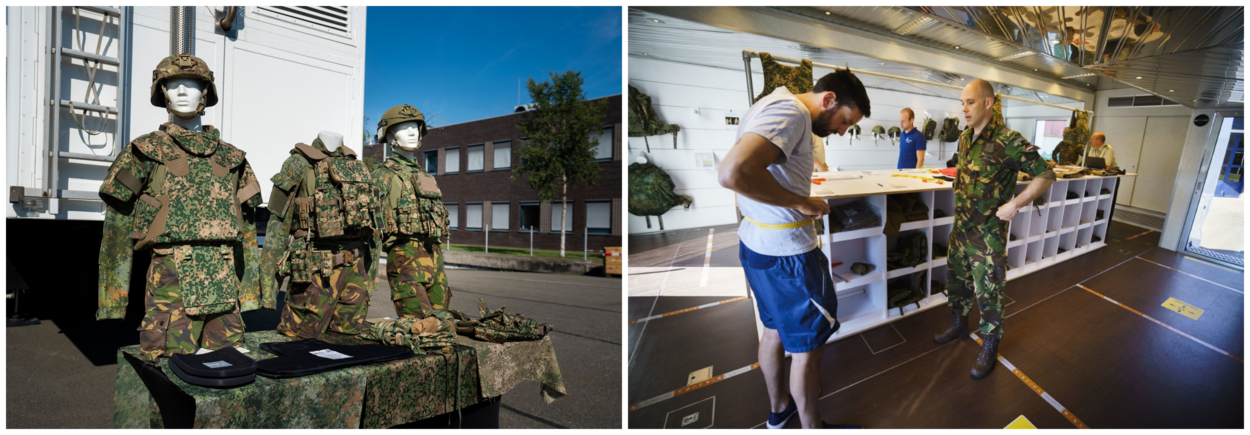 Elk kwartier stappen 2 nieuwe kerninstructeurs de pasmobiel in. Om te voldoen aan de RIVM-richtlijnen hanteren ze daar op aanwijzing van het KPU-personeel zelf de meetlinten. Passen hoeft niet; de KPU-experts hebben genoeg aan de maten die ze in het computersysteem opslaan. "Die helm zal een verademing zijn", stelt korporaal Teun terwijl hij zijn hoofd naar beneden laat hangen. "De oude helm schoof snel naar voren; vooral bij een liggende schiethouding heel irritant. Bovendien geeft deze ruimte voor gehoorbeschermende oorkappen, die voorheen nogal in de weg zaten. Een stuk veiliger dus", vindt de monteur bij 11 Luchtmobiele Brigade.