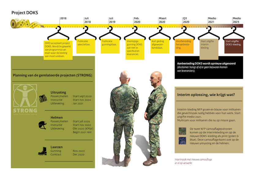 De invoering van het modernere DOKS blijft echter onverminderd van belang vanwege de beschermende kwaliteiten van deze kleding. De uitrol van de DOKS-gevechtskleding begint naar verwachting niet eerder dan medio 2023 en zal, zoals eerder al beoogd, gefaseerd worden uitgerold. Militairen krijgen dus 2 keer een kledingpakket.