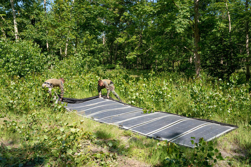 Een voorbeeld van samenwerking en innovatie is DMO’s MIND (Military Innovation By Doing). Daarbij hebben Defensie en kennisinstituut TNO een innovatheek opgezet. Hier kunnen eenheden innovatieve producten lenen en in de praktijk testen. Neem bijvoorbeeld de draagbare zonnepanelen (foto boven) die het Korps Mariniers en het Kenniscentrum Wapens en Munitie (KW&M) nu test. (foto John van Helvert)