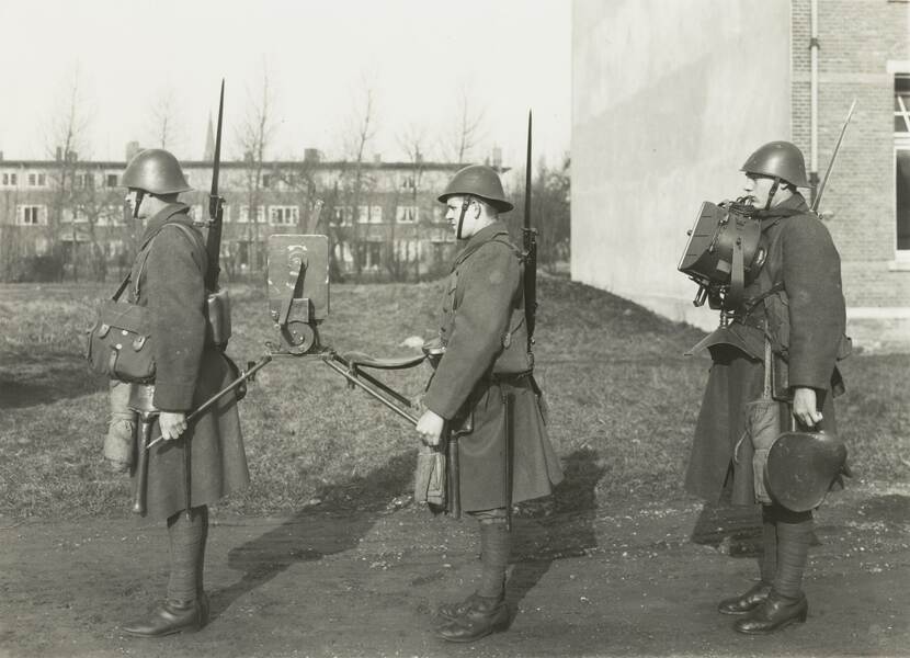 (foto boven: 3 soldaten met opgelegd geweer in een infanteriestelling met zicht op de bruggen over de IJssel bij Fort Westervoort (mei 1940). Het ontwikkelde infraroodsysteem zou dienst moeten doen bij grote rivieren zoals de Rijn en de IJssel en eventueel bij grensovergangen op het land. Bij de inval in mei 1940 was het seriematig geproduceerde systeem nog niet beschikbaar. Foto: collectie NIMH)