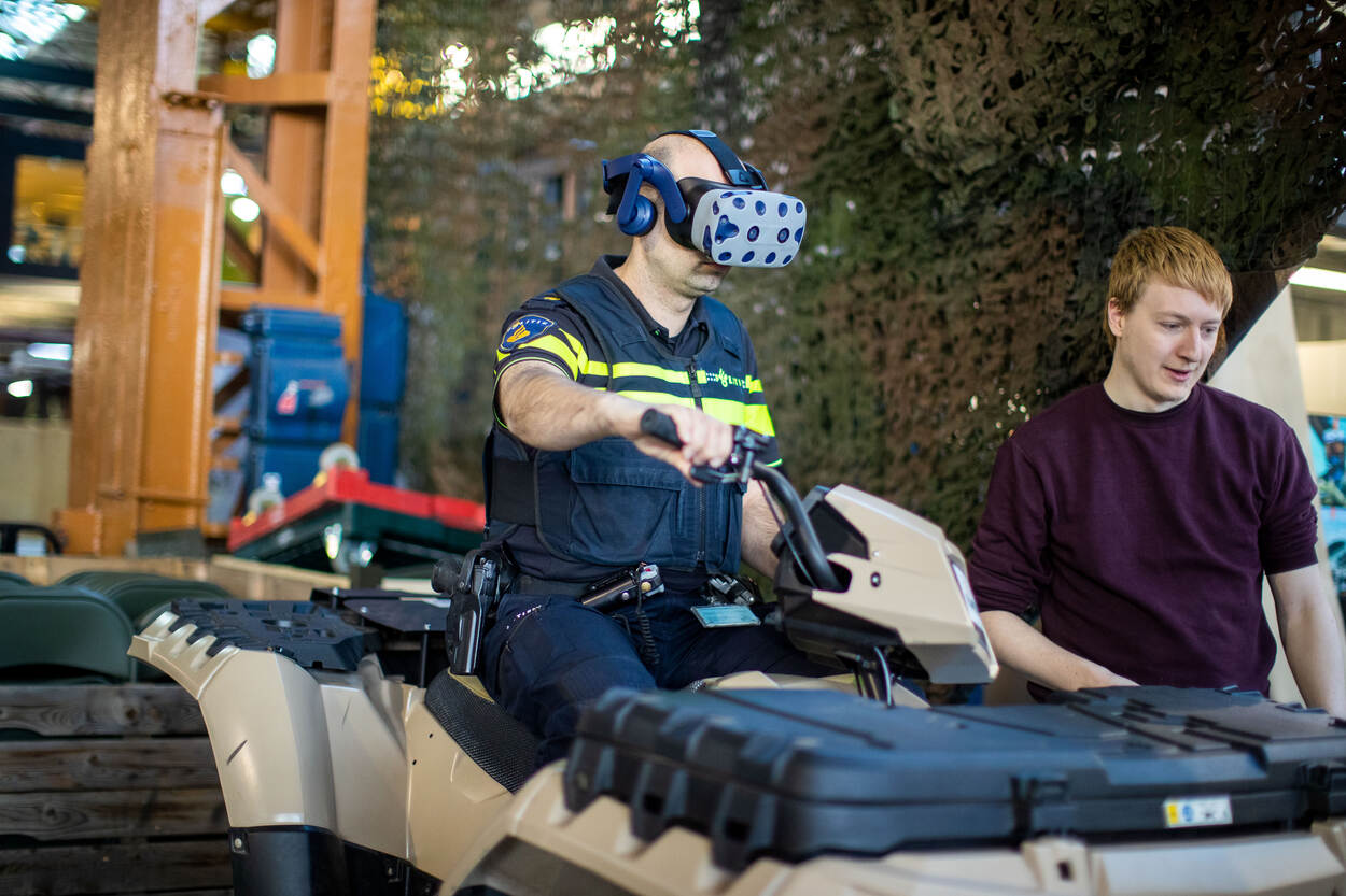 Eerder stond de quad-simulator op het tech event DefLab in het Nationaal Militair Museum, waar bezoekers in een virtueel spel een rondje op de quad konden rijden. Het Korps Commando Troepen was toen al erg enthousiast. Nu krijgt dat dus een vervolg met de productie van 3 nieuwe systemen, die in een virtuele kopie van een echte operationele omgeving kunnen rijden. Niet zozeer als simulator om beter op een quad te kunnen rijden, maar om de overdracht tussen eenheden in een genetwerkte omgeving beter te laten verlopen. (Foto: sergeant-majoor Maartje Roos)