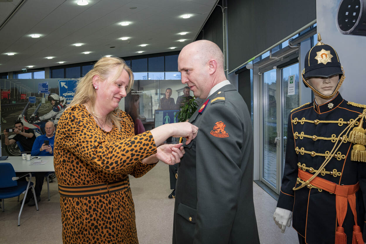 Dé autoriteit op het gebied van ceremoniële tenues en een onmisbare schakel op Prinsjesdag en Veteranendag. Sergeant-majoor Marco Venema van het KPU-bedrijf werd vorige week voor zijn inzet beloond met Ereteken voor Verdienste in Brons. Directeur Wapensystemen & Bedrijven brigadegeneraal Ernst Dobbenberg reisde naar Soesterberg voor de overhandiging. Dobbenberg omschreef de teamleider bij het Depot Ceremoniële Tenuen als “een perfect toonbeeld van dienstbaar vakman, leider en instructeur. Met zijn praktijkervaring, inlevingsvermogen naar de te kleden klanten en zijn gedrevenheid om tot visuele én functionele perfectie te komen, onderscheidt deze vakman zich op zeer verdienstelijke wijze.” (foto: Louis Meustee)