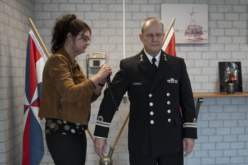 Hoofd JIVC/Maritieme IT kapitein ter zee Rob Oudelaar prees het optreden van zijn medewerker, Patricia van Brakel mocht de versierselen opspelden.