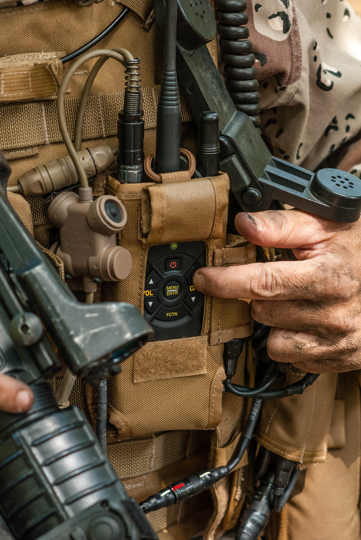 De radio zendt periodiek zijn positie uit, waardoor alle gebruikers binnen het peloton zichtbaar zijn voor de commandanten. De ‘oortjes’ met draadloze spreeksleutel geven toegang tot de radio voor spraak, maar bieden tegelijkertijd ook gehoorbescherming.