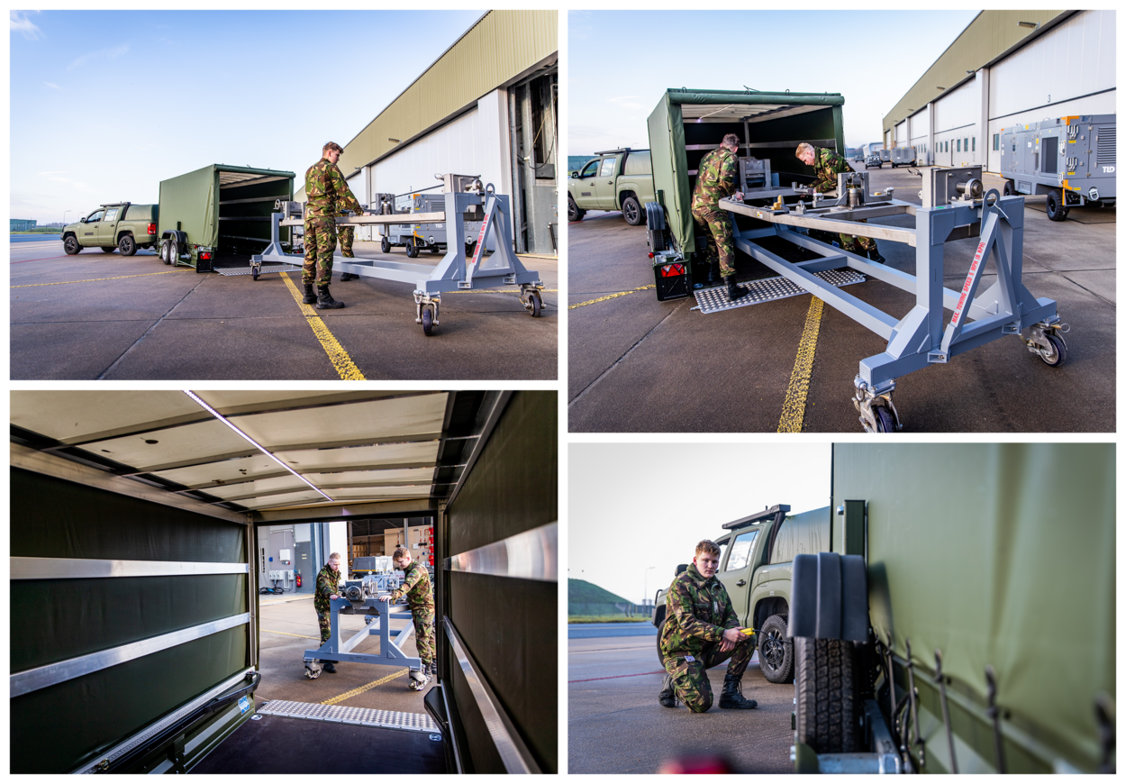 Het levert een aanhanger op, waarover de dienstdoende specialisten Support Equipment F-35, de sergeanten Yorick van Veenen en Ramon Harms, zeer zijn te spreken. “Het werkt allemaal heel simpel en vooral effectief. Het is even passen en meten, maar dan heb je ook wat”, zegt Harms.