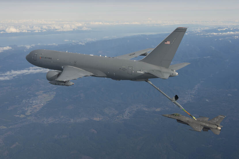 Op Miho Air Base komen de vliegtuigen bij het heropgerichte 405 Air Refuelling Squadron. De huidige tankervloot van vier KC-767’s en twee KC-130H’s, staat op vliegbasis Komaki bij 404 Air Refuelling Squadron. De KC-46 is niet alleen bedoeld als tanker, maar kan ook worden ingezet als vrachtvliegtuig voor humanitaire missies of bij rampenbestrijding. Bijzonder aan het toestel is dat niet alleen Japanse vliegtuigen er voor brandstof terecht kunnen, maar ook de Amerikaanse vliegtuigen van de US Air Force, Navy en Marines. (foto: Boeing)