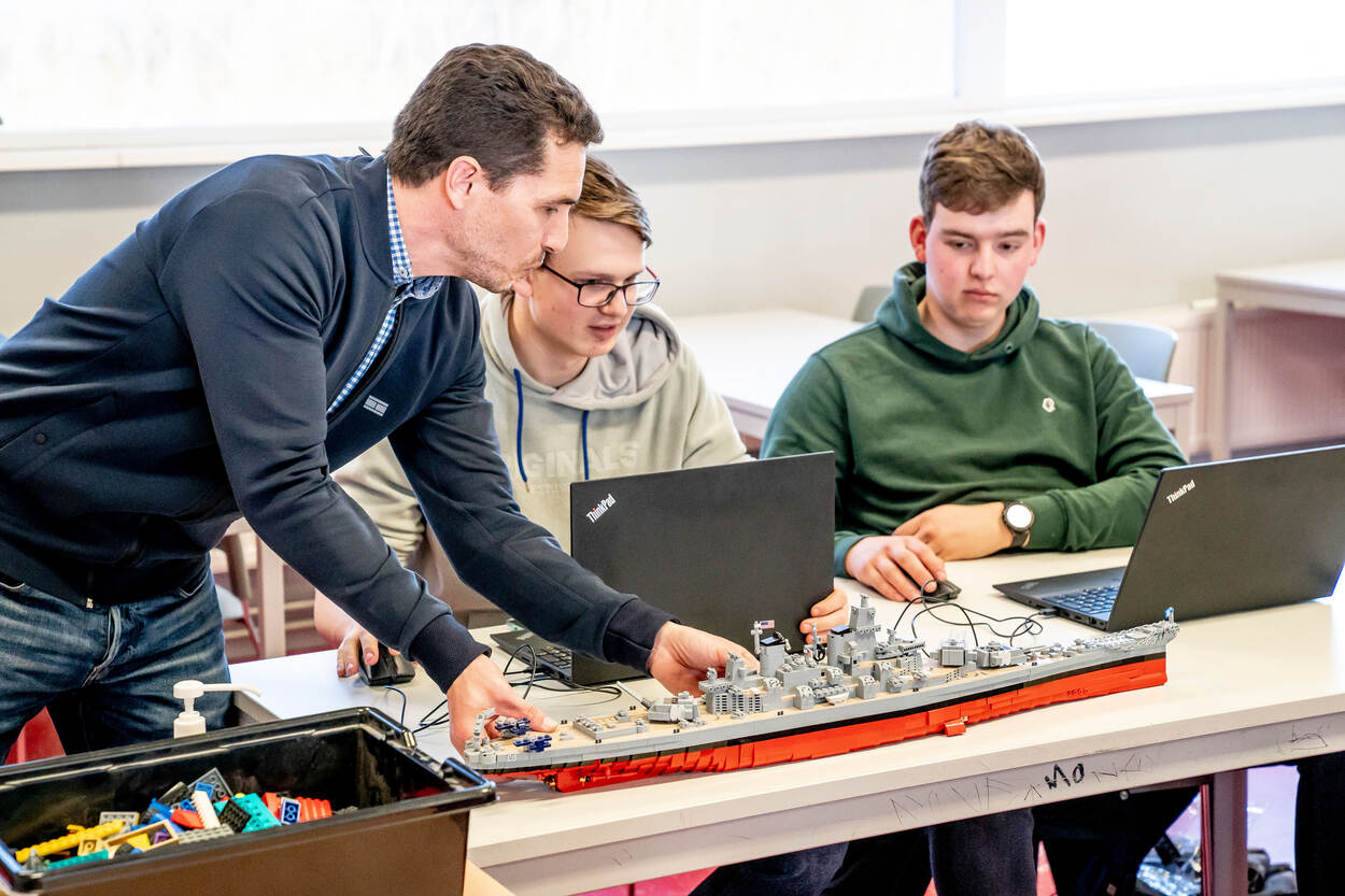 “Mogen we hier nu echt gaan legoën?”, vraagt een van de studenten zich hardop af wanneer hij de doos bouwstenen en een van legoblokjes nagemaakt Amerikaans battleship (USS Missouri) in de klas ziet staan. Ja dus! De derdejaars studenten van de opleiding middenkader engineering worden uitgedaagd om hèt marinevaartuig of -voertuig van de toekomst te ontwerpen en met echte legostenen na te bouwen. De beste ontwerpen worden getoond tijdens de Marinedagen van dit jaar.