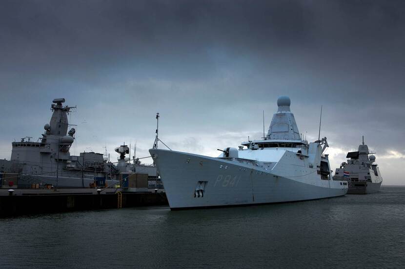De Zeeland ligt voor onderhoud in een droogdok in Den Helder. Er was vannacht geen personeel aan boord.
