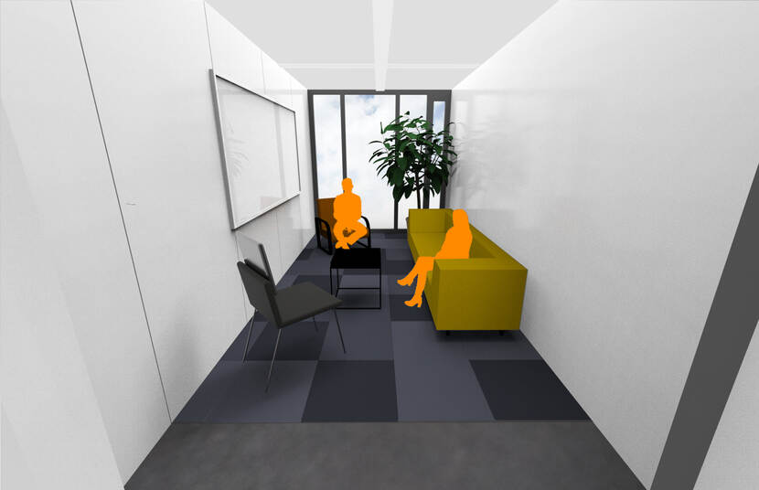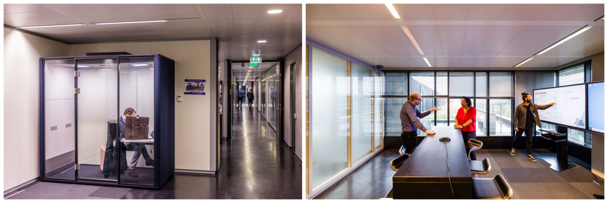 Afgelopen jaar zijn op de vierde etage stapsgewijs de overige veranderingen doorgevoerd en de eerste proefopstellingen gerealiseerd. De komende maanden is het een kwestie van de laatste puntjes op de ‘i’. Visuals aan de muur, planten in de lege hoeken en het installeren van hybride IT-middelen zodat er ook digitaal effectief met elkaar kan worden gewerkt.
