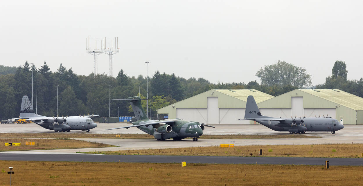 Heden en mogelijke toekomst in één beeld gevangen. De Braziliaanse C-390M taxiet op Eindhoven langs een C-130H (links) en verlengde C-130H-30 van 336 Squadron. Foto: Joris van Boven