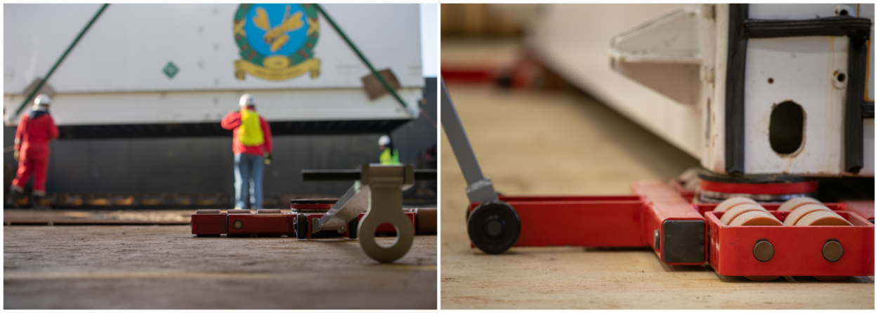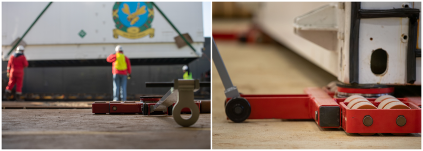 Niets dan lof dus voor de inzet van de Defensie vervoerder DVVO. Maar dan was er ook nog de te krappe ‘entree’ voor de containers. “Voor deze operatie is speciaal een deel van de wand uitgezaagd. Daarbij is ook een aantal leidingen verlegd. Nu de containers binnen zijn, kan het gat weer gedicht, om over pakweg 4 jaar weer dienst te doen voor de verplaatsing naar het nieuwe simulatiecentrum. Tot nu toe loopt alles op rolletjes”, grapt overste Van Rijn als de eerste container daadwerkelijk op rollers de hal binnenrijdt. “Dat moet trouwens uiterst secuur, want er is weinig ruimte om te manoeuvreren.”