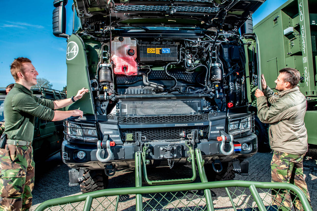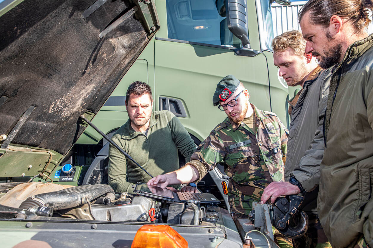 Projectleider DO-MAINT kapitein Alexander Deemter, tweede van links, geeft een demonstratie aan een onderhoudseenheid in Schaarsbergen.