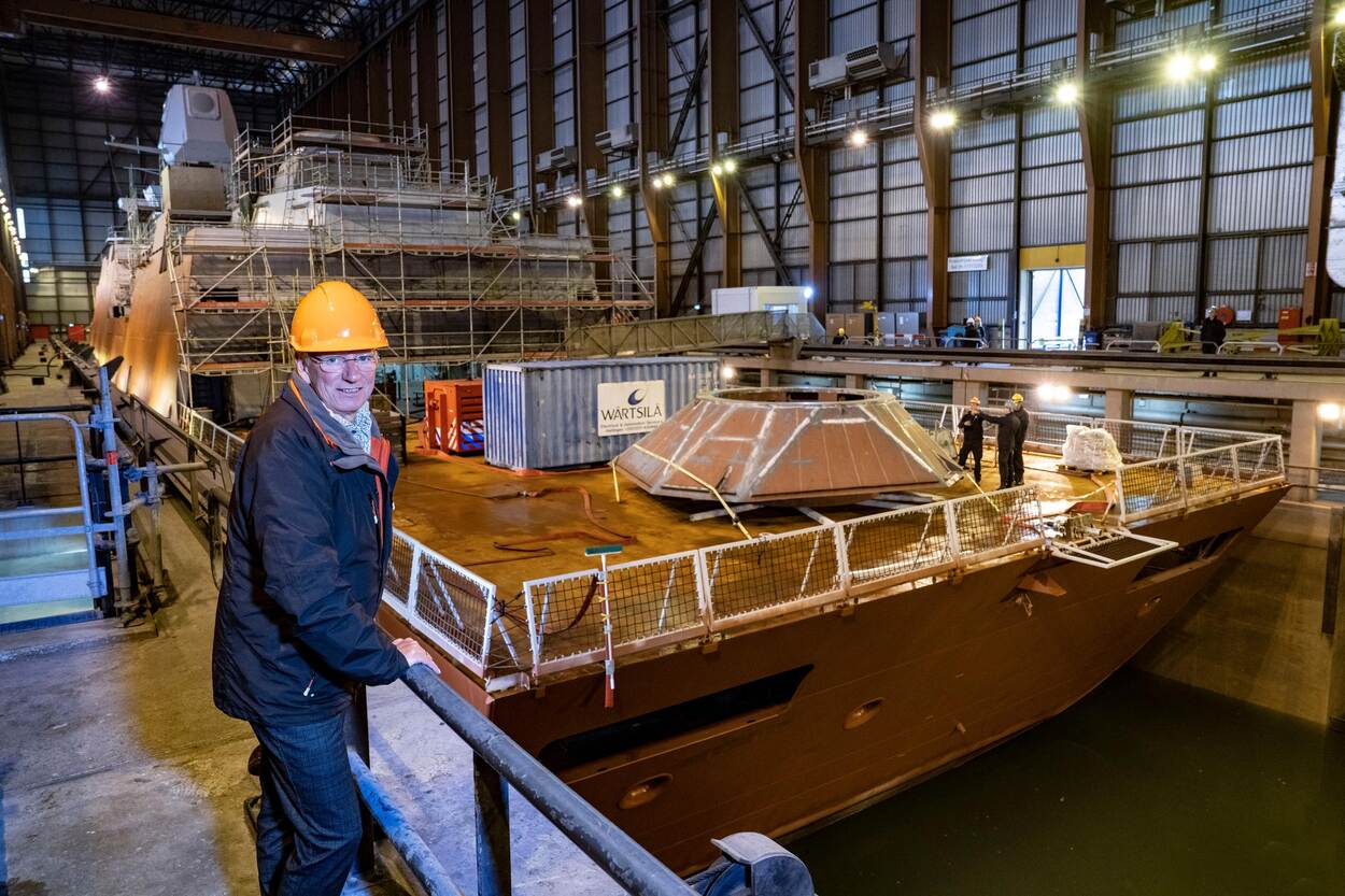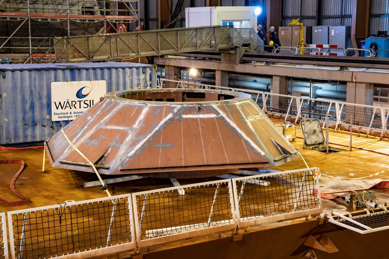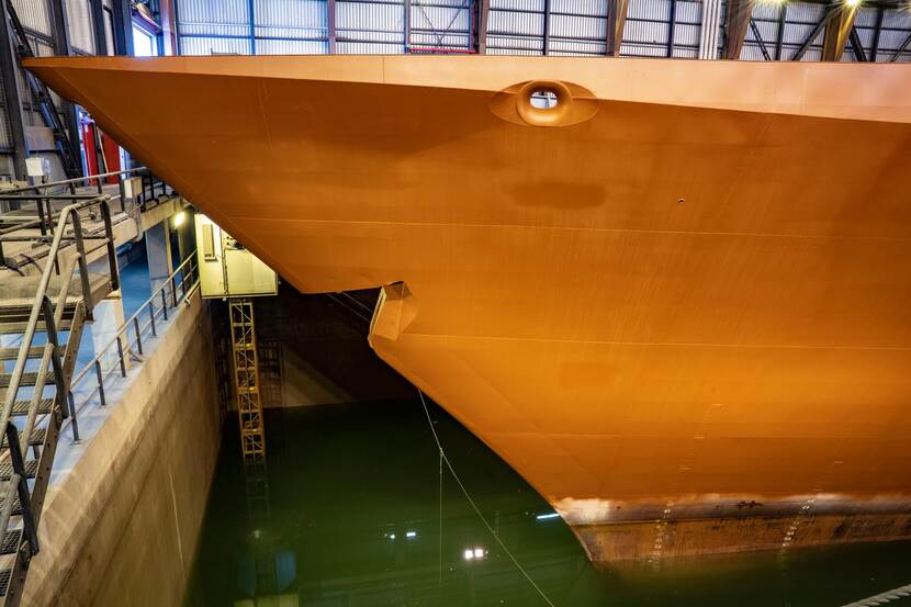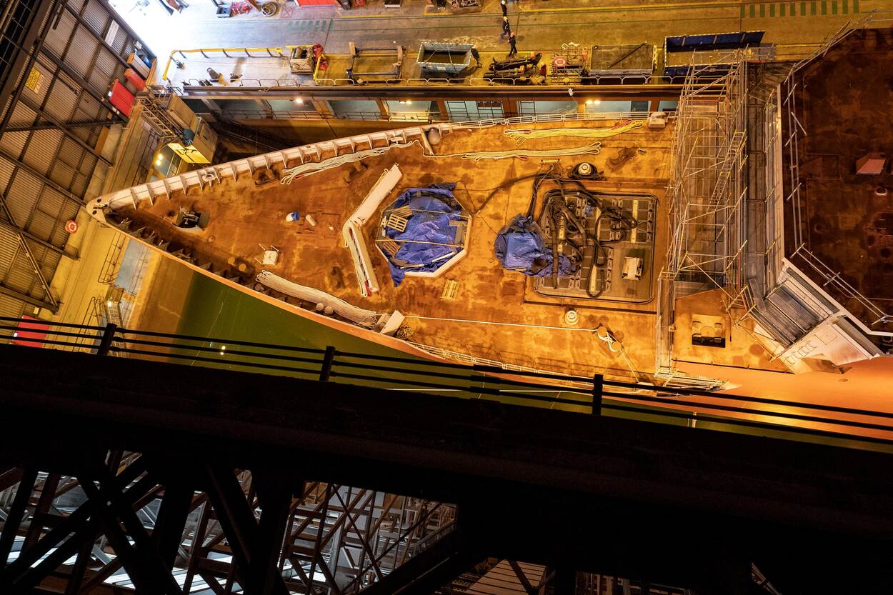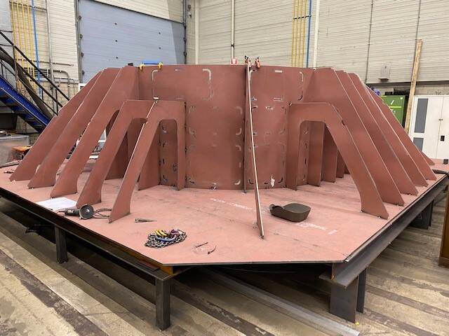 De draagconstructie voor het kanon wordt straks in zijn geheel over het schip getild en op het voordek geplaatst en in het schip bevestigd. Het was nog een hele klus die als halffabricaat op tijd aan boord te krijgen” zegt Timmers. De bouwtekeningen van deze complexe constructie waren net even anders dan de ontwerptekeningen. Bij de productie moesten die nog worden aangepast, maar de medewerkers van de DMI hebben dit vakkundig gedaan. De opbouw van het schip zal zeker nog tot medio dit jaar duren. Na de plaatsing van het kanon begint de integratie van het kanon met alle systemen aan boord van het schip. Het zal zeker nog tot eind 2024 duren voordat er een werkend kanon aan boord van de Zr. Ms Evertsen staat.