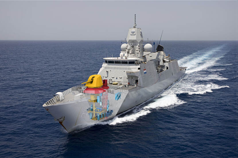 “Dat we op de draagconstructie van het kanon vijf ton hebben kunnen besparen, is vooral te danken aan de kwaliteit van de projectmedewerkers”, roemt Timmers. Na complexe sterkteberekeningen kwamen zij er precies achter hoe de draagconstructie zich gedroeg. Onder andere tijdens het varen, bij een onderwater explosie en het afvoeren van het kanon. Het was een behoorlijke uitdaging. Met dank aan de techneuten van DMO, de DMI, en van het engineersbureau Nevesbu uit Alblasserdam, is het resultaat een geoptimaliseerde constructie met geen grammetje teveel aan materiaal. “De samenwerking leverde het uiteindelijke resultaat op”.