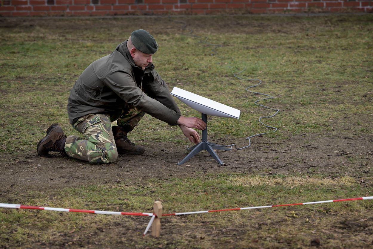 Sergeant Fabian Jansen plaatst de compacte Starlinkschotel.