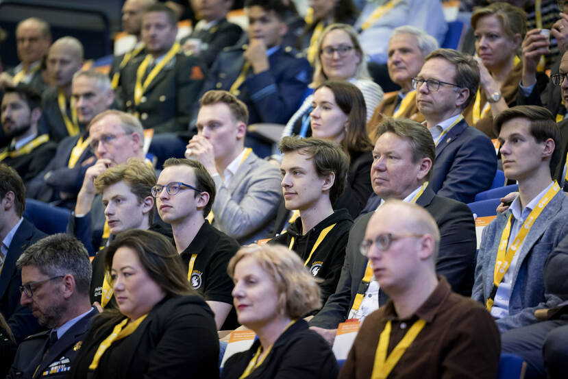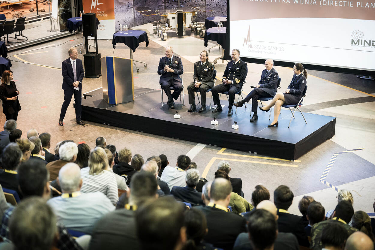 De Erasmuszaal op het terrein van ESA ESTEC was gevuld met ruim 200 belangstellenden vanuit Defensie, bedrijfsleven, kennisinstituten en onderwijsinstellingen. Dat is nu precies waarom het 3 jaar lang heeft gedraaid bij het Space Café van MIND: het delen van kennis en het bevorderen van samenwerking met civiele partners. Met andere woorden: het opbouwen van een ecosysteem, waarin Defensie, andere overheden, industrie, kennisinstituten en onderwijsinstellingen intensief met elkaar samenwerken.