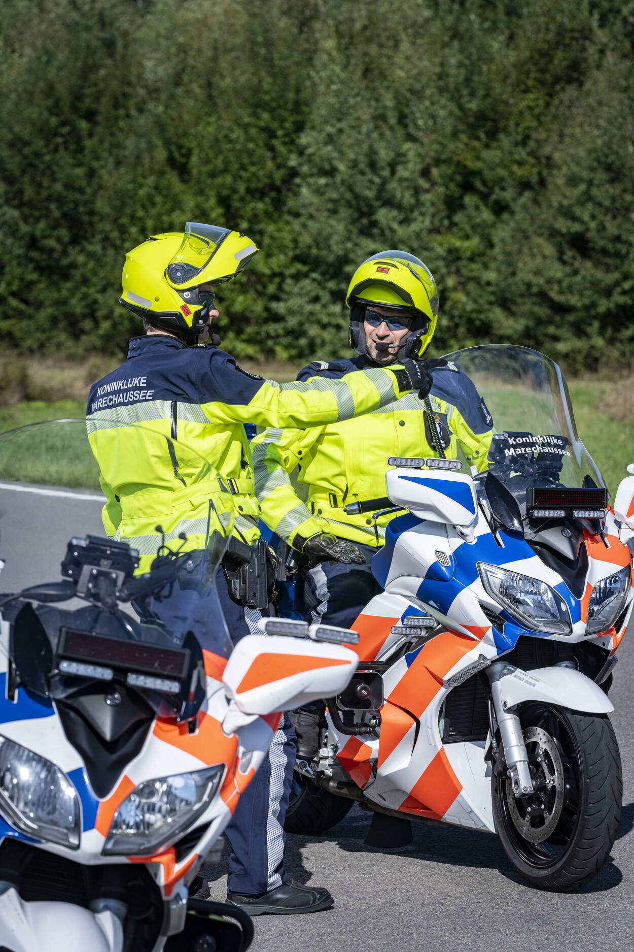 Daarmee verandert het uiterlijk van de motorrijders op de weg. “De politie reed al langer in het geel rond en heeft hier goede ervaringen mee”, weet majoor Ton, dossierhouder Kleding en Uitrusting bij Staf KMar. De pakken van beide diensten lijken nu erg veel op elkaar. “Geen punt, aangezien we vaak met hen samenwerken: we zijn ook opsporingsambtenaren met dezelfde bevoegdheden als de politie. Uiteraard staat er wel groot ‘Koninklijke Marechaussee’ op het pak.”