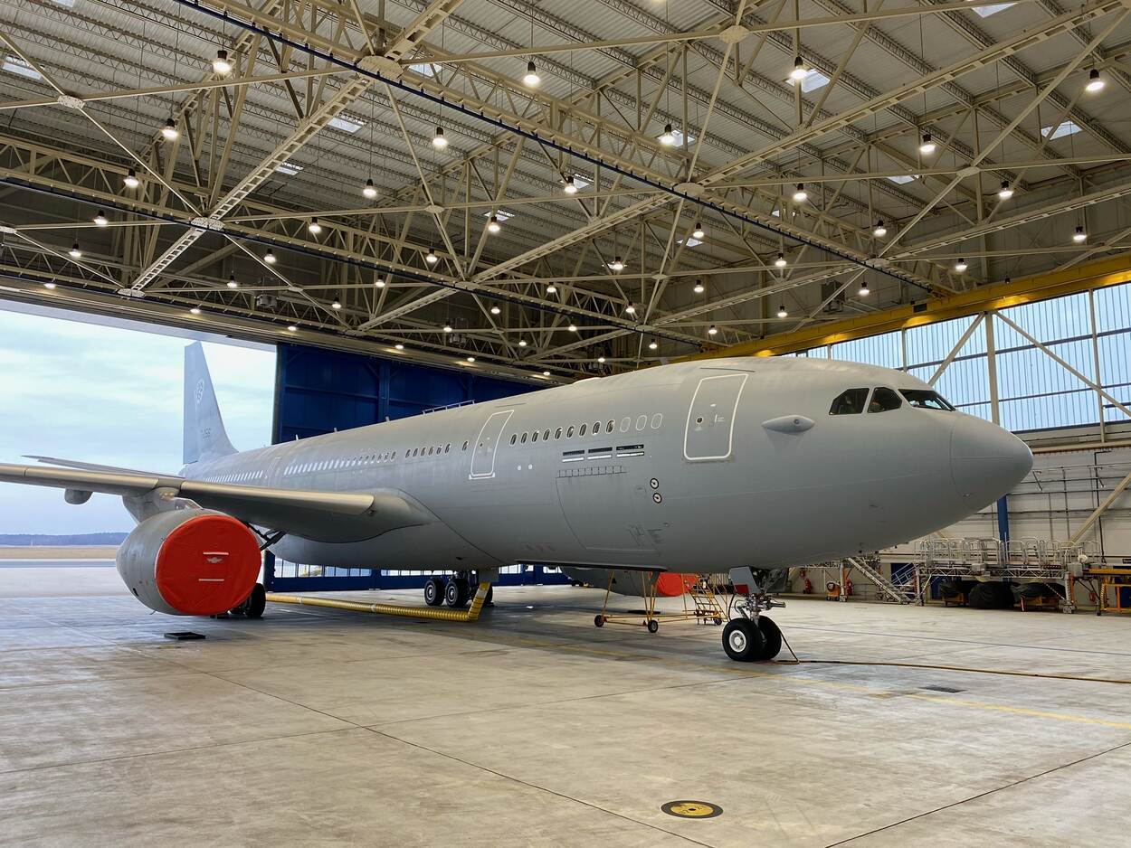 De A330 in de hangar op vliegveld Keulen. Gereed om tot vliegend ziekenhuis te worden omgebouwd.