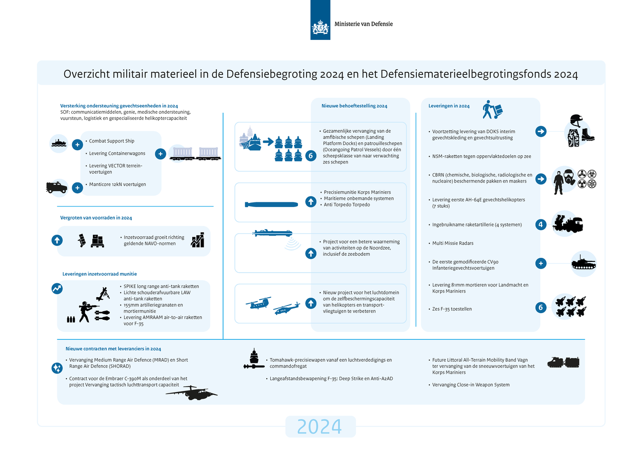 Van meer communicatiemiddelen voor Special Operations Forces tot aan de levering van F35: Defensie is ook komend jaar volop in beweging op het gebied van materieel en IT. Wat wordt er komend jaar geleverd en welke behoeften zitten eraan te komen? In de onderstaande infographic een greep uit de plannen voor 2024.
