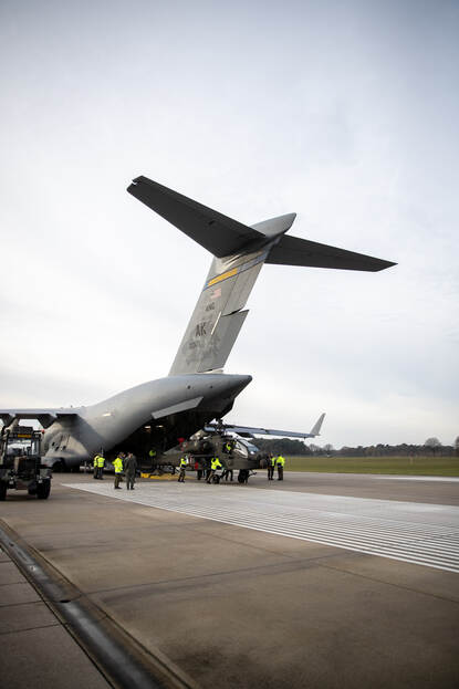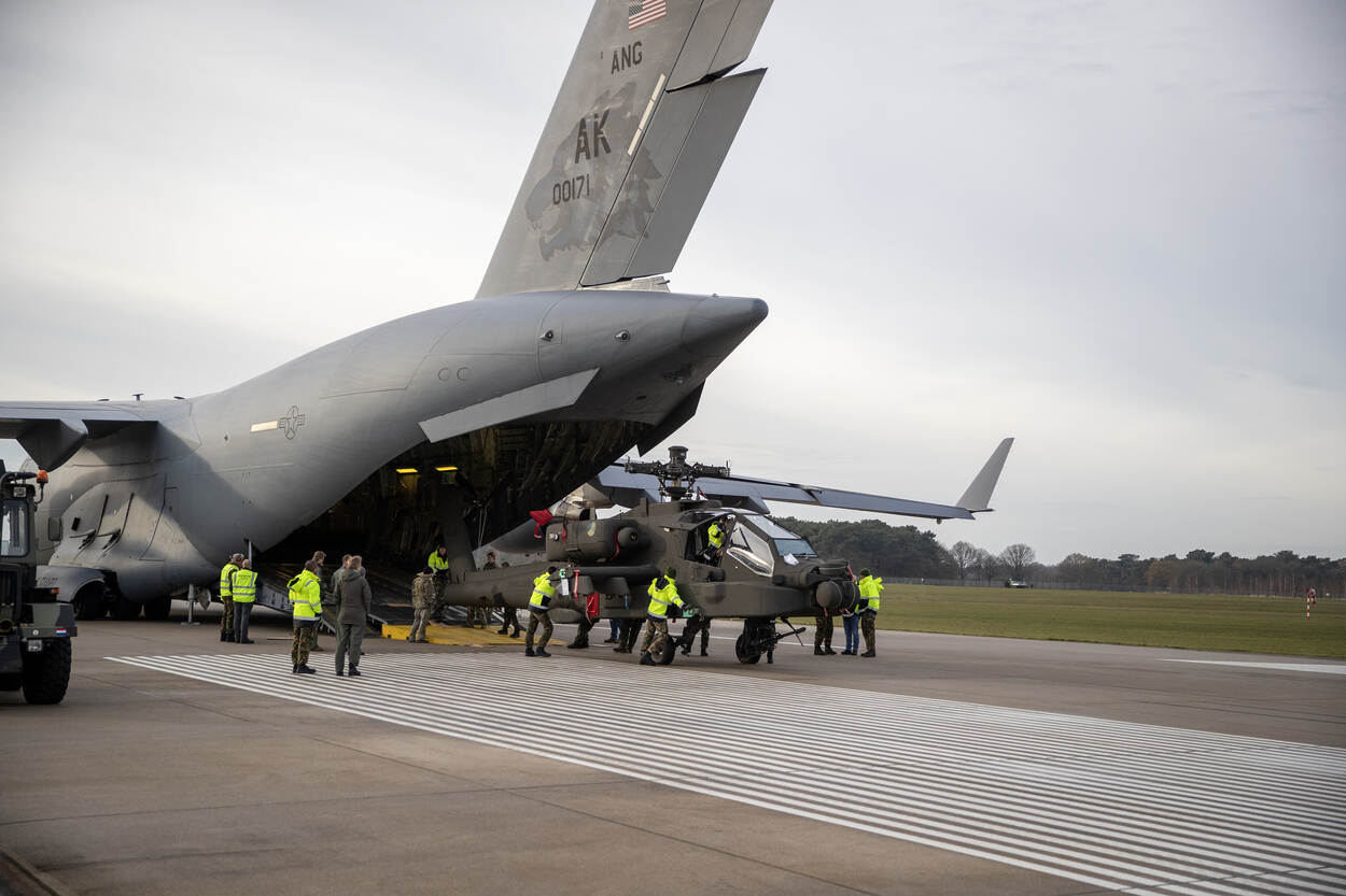 De snijdende winterwind is geen partij voor luitenant-kolonel John de Groot. Hoe lang het ook duurt om de toestellen uit de C-17 te krijgen, de projectleider van COMMIT zal met eigen ogen zien hoe deze twee Apache AH-64E’s van de ramp afrollen.