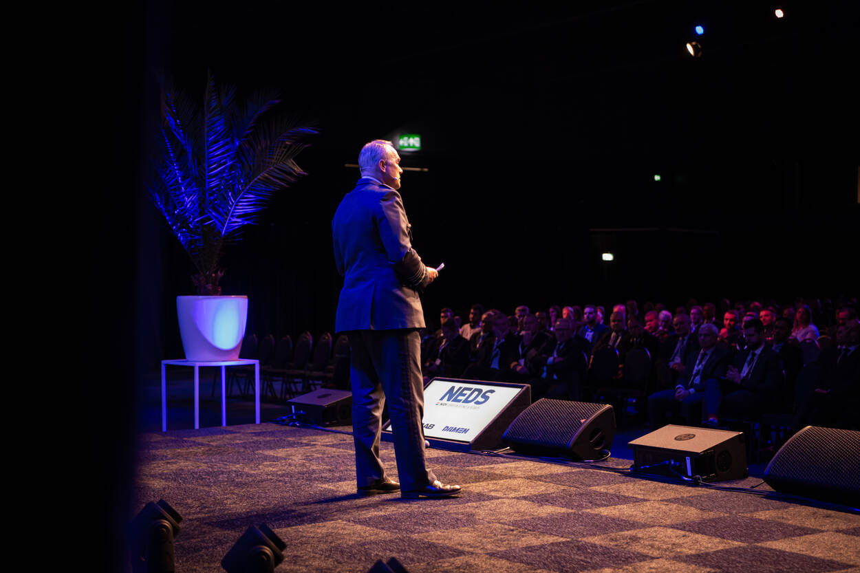 Generaal Eichelsheim op de rug gezien op het podium van de NEDS met publiek op de achtergrond.