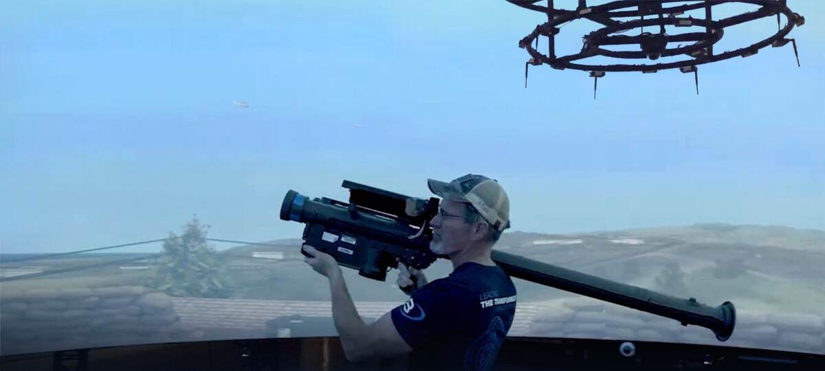 Medewerker van het Amerikaanse bedrijf Blue Halo met Stinger anti-tankwapen in zijn hand in de dome van de Advanced Stinger Trainer.