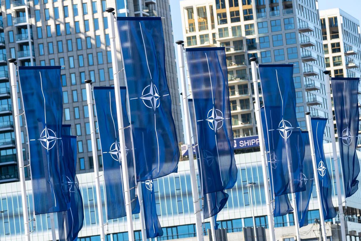 Meerdere NAVO-vlaggen met op de achtergrond flats.