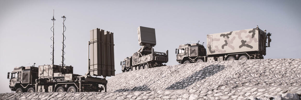 Alt-tekst: Drie vrachtwagens van het IRIS-T SLM luchtverdedigingssysteem met lanceerinrichting, radar en ondersteuning.