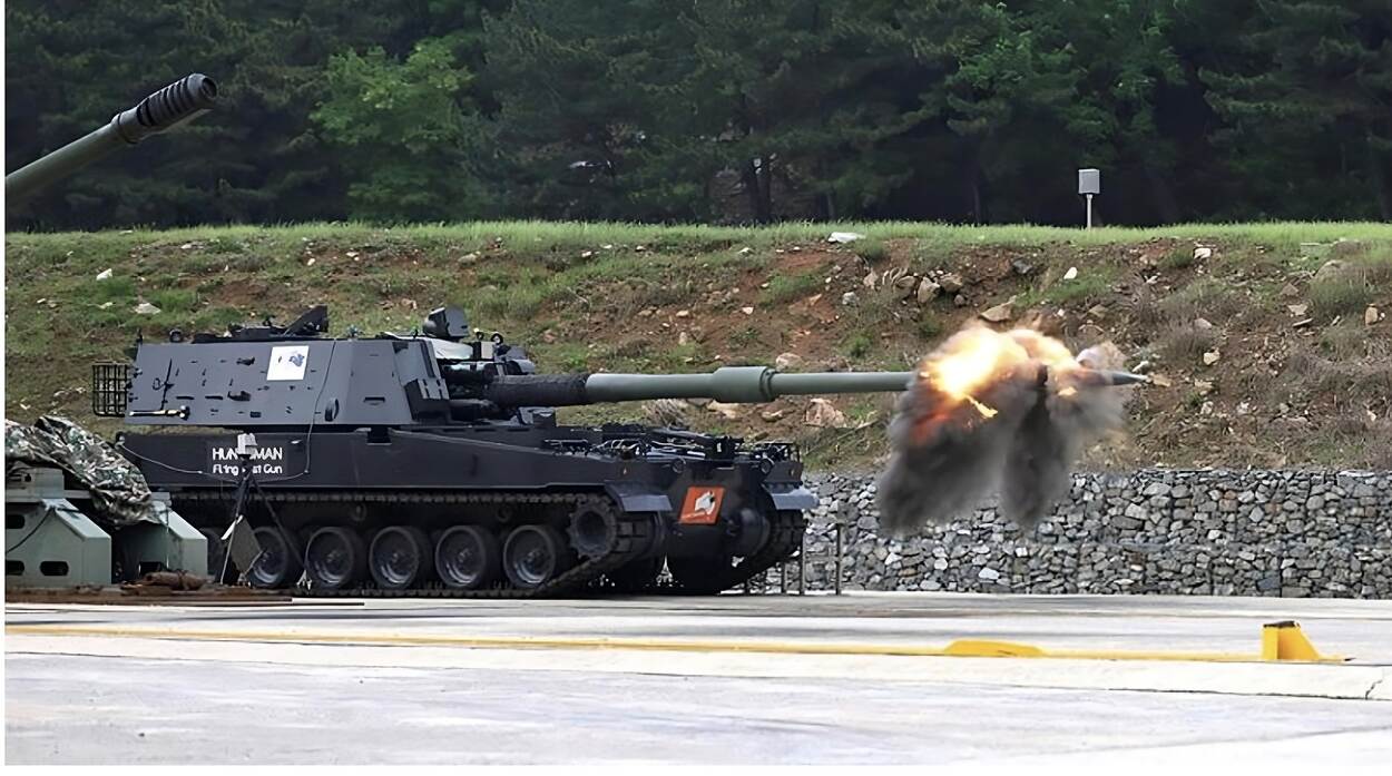 AS9 Huntsman pantserhouwitser tijdens een schot op een schietterrein.