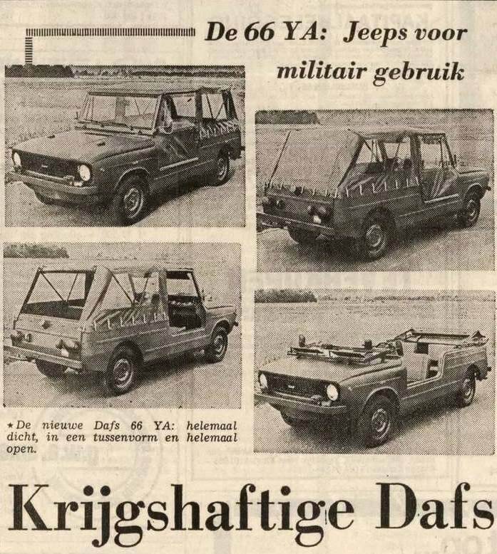 De in Eindhoven geassembleerde auto werd uiteindelijk de DAF 66 YA, gebaseerd op de modernere civiele 66-variant. De militaire DAF-codering stond achter het typenummer, vanwege de commerciële oorsprong. De Y stond voor militair, de A voor algemene inzet. Technisch waren er geen verschillen behalve dat de 66 YA was uitgerust met een 24-volts systeem geschikt voor radioapparatuur. De verzwaarde carrosserie werd versterkt met opgelaste strips met het oog op het ietwat lompere gebruik binnen Defensie. Het was een open wagen die met linnen kap kon worden afgesloten. Omdat de DAF 66 afweek van de eerder geteste 55, werd deze opnieuw beproefd en moest de Eindhovense autobouwer een aantal constructieve wijzigingen doorvoeren.