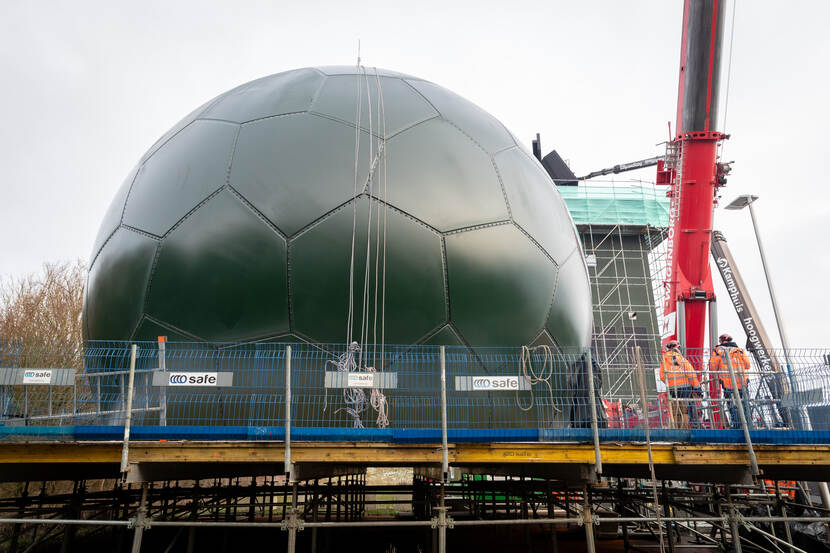 Als de wind rond het middaguur gaat liggen, hijst de kraan de Radome boven de radar. De kraanmachinist laat de koepel zakken op de twee meter hoge ring rondom de radar waarna zijn collega’s op de toren de Radome met touwen op z’n definitieve plek sturen.