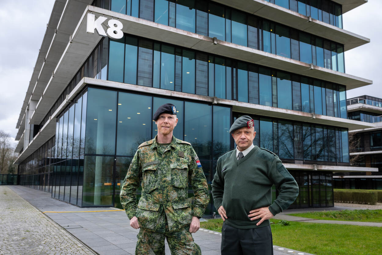 Twee militairen voor een gebouw op de Kromhoutkazerne.