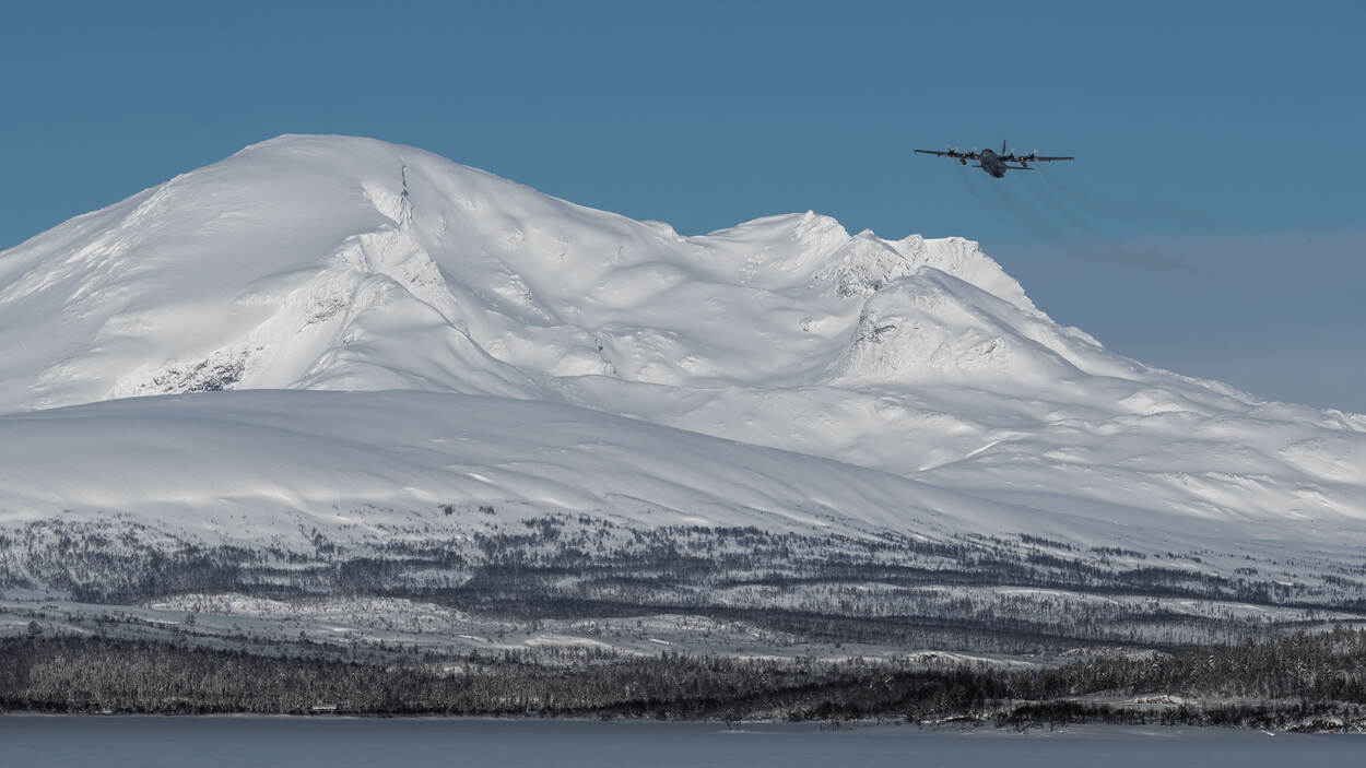 Een C-130 Hercules vliegt boven de sneeuw in Noorwegen.