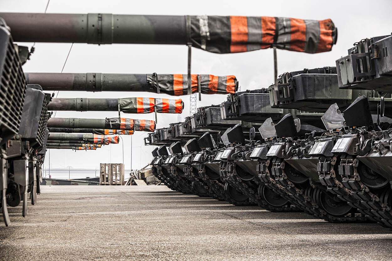 Leopardtanks staan neus-aan-neus opgesteld in de Eemshaven voor transport naar Finland.