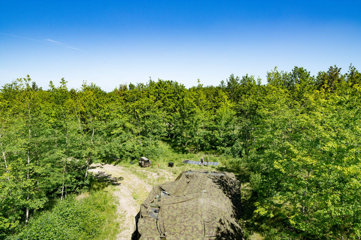 Een opstelling met voertuigen onder een camouflagenet in het bos.